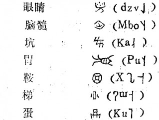 下面,从现存彝文中尚存的一部分象形文字、指事文字中,试举出若干字例。象形文字如: