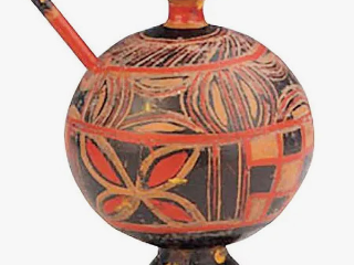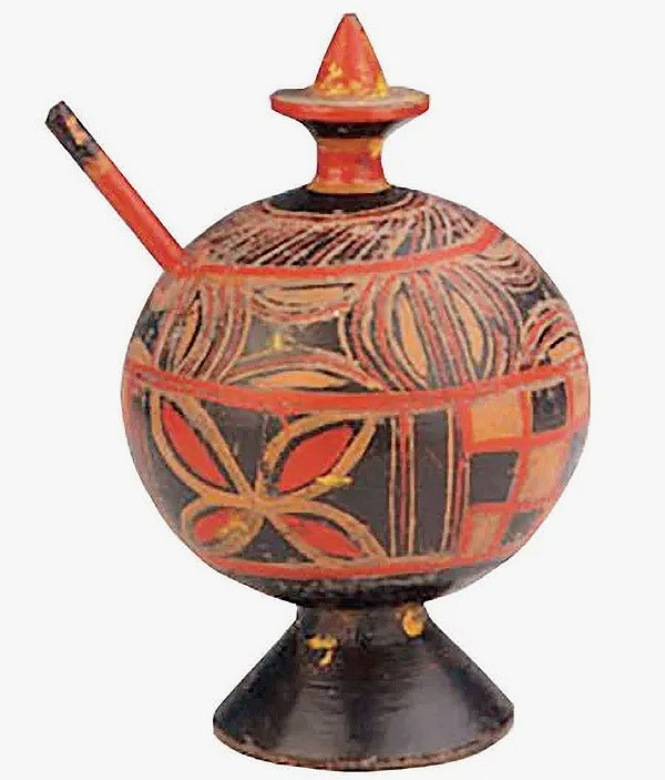 咂嘴酒壶,是彝族漆器中最令人叹为观止的酒具,根据其形状的差异,一种是圆扁形酒壶,彝语称“莫耶”;一种是圆球形酒壶,彝语称为 “撒勒钵”(“撒尔博”“撒力宝”“伞拉壶”);一种是动物形酒壶,鸽形为主,彝语称鸽形酒壶“黑沙”。鸽形咂嘴酒壶容量一般比较小;扁圆形和圆球形咂嘴酒壶的规格则比较多一些,有的酒壶容量比较小,只能装二两酒左右;有的则比较大,能装二斤酒左右。咂嘴酒壶最早的制作时间无法考证,从彝族漆器传承者口中调查得知是“比较久远”,但从彝族漆器已有1000 多年的发展历史来看,咂嘴酒壶的历史应该也是比较久远的。在迄今发现有文字、图片记载或实体酒壶中,最早的是明代的圆球形酒壶(图1),其次是清代的扁圆形酒壶(图2)和鸽形酒壶(图3)。这些酒壶虽历经几百年的时间洗礼,却依然造型完好、色彩鲜明,也能够正常发挥其功用。至今,咂嘴酒壶依然具有非常旺盛的生命力,一方面依然是彝族人民日常生活用品之一;另一方面,随着彝族地区旅游资源的开发,咂嘴酒壶也成为消费者最喜爱的彝族特色产品,其充满彝族特色的图案纹样、色彩,尤其是“酒壶没有入口和出口”“酒壶不用瓶塞或者瓶盖”的神秘特征,更深深地吸引着海内外游客,成为消费者最喜欢购买的旅游纪念品之一。